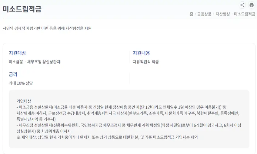 - 추천서발급: 미소드림적금 가입요건을 충족하는 이용자에게는 '자산형성상품 (미소드림적금) 참여 추천서'가 발급됩니다.